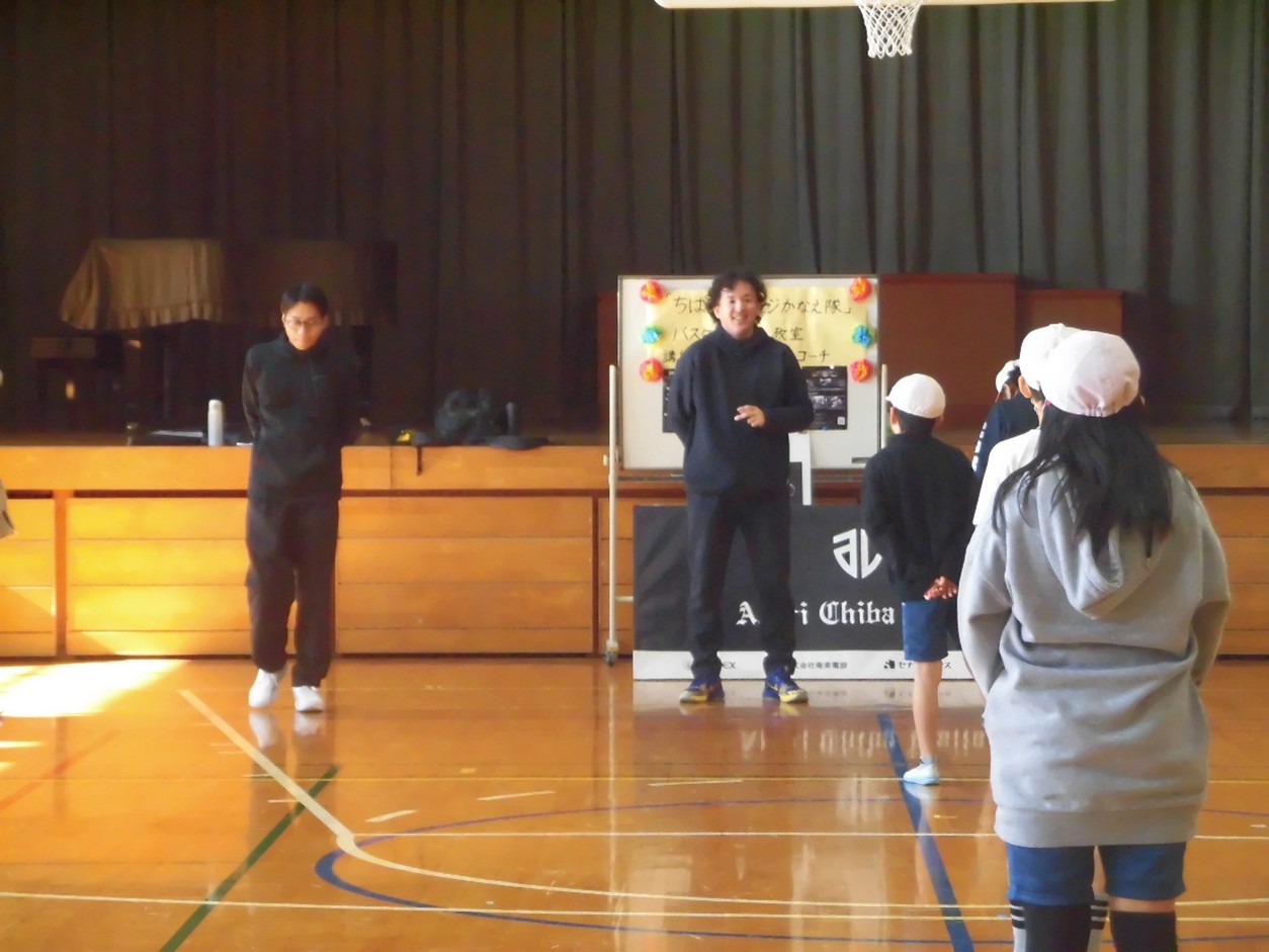 地元千葉のプロバスケットボールチーム「アルティーリ千葉」から岸本コーチと井上さんが来てくれて、5,6年生にバスケットボール教室を開催してくれました。パス、ドリブルなどのポイントを教えてもらい、みんながんばって取り組んでいました。