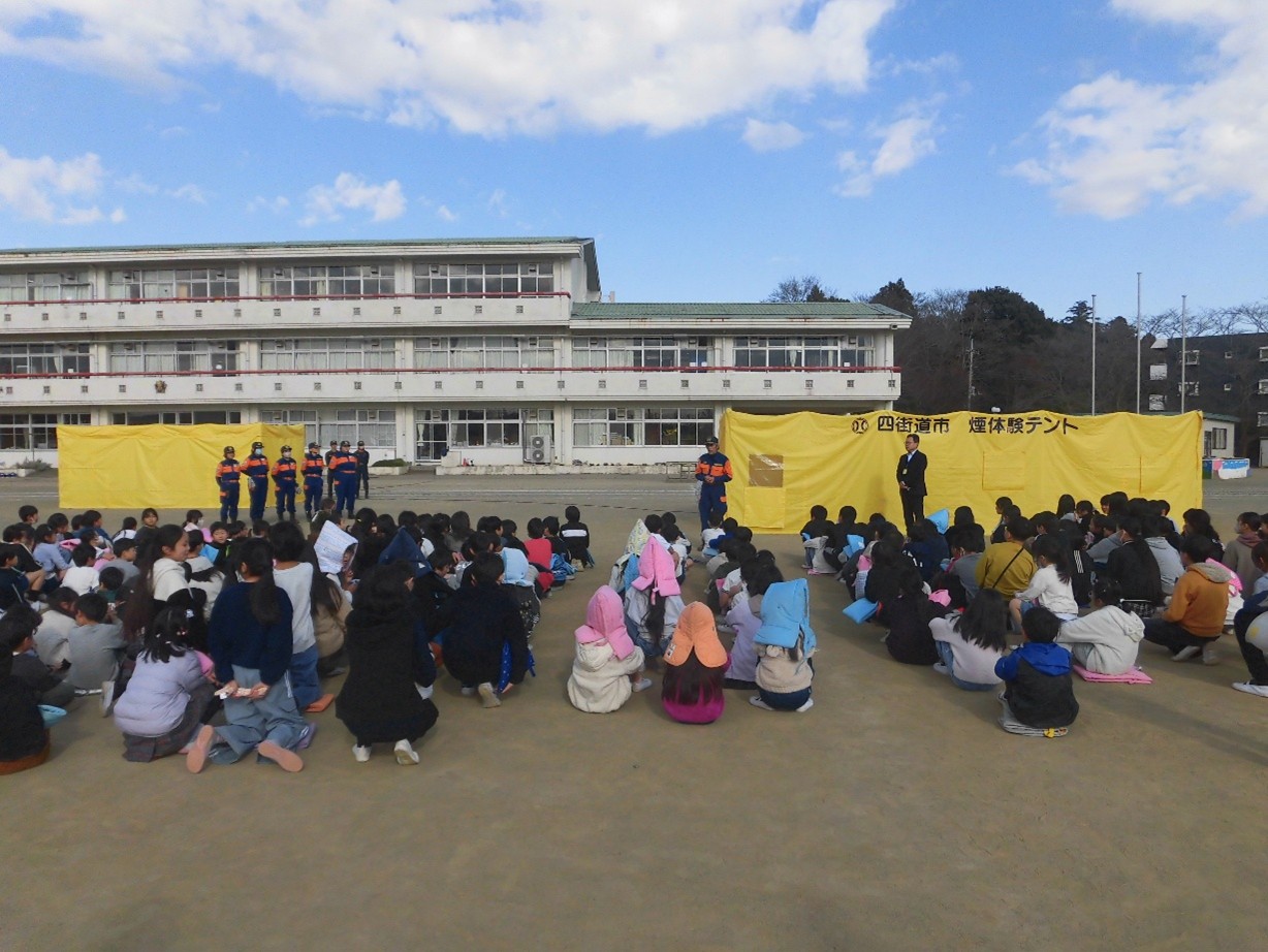避難訓練では、どの学年も「おかしも」を意識して避難することができました。煙体験では、火事の際にハンカチで口を覆うことや、姿勢を低くすることの重要さを感じることができました。煙体験を行うに当たって、消防団、消防署員、市役所の方々が準備をしてくれました。ありがとうございました。