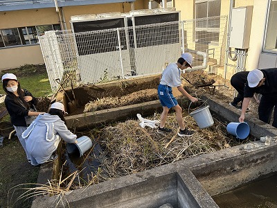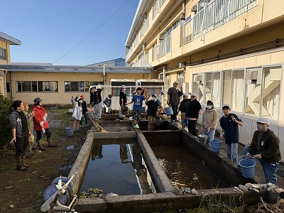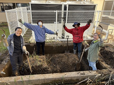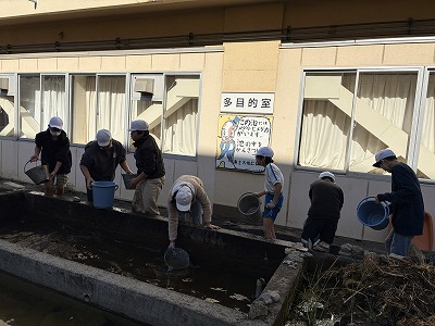 保護者のみなさまにお手伝いいただき、中庭の池掃除を始めました。