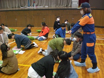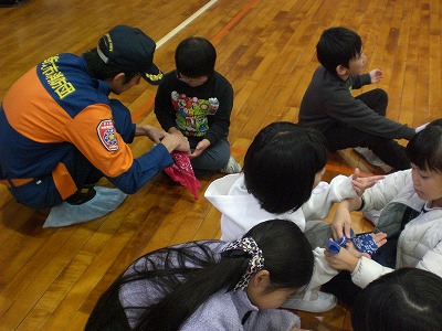 3年生社会科「火事からくらしを守る」の学習の一環で、四街道市消防本部の方々にご協力いただいて消防・救命救急体験を行いました。