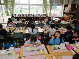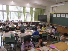 今日から、1年生の給食がスタートしました。6年生のお兄さん・お姉さんが配膳の手伝いに来てくれ、どのクラスもスムーズに食事の準備ができました。1年生にとって、給食初めてのメニューは、 『ご飯・鱈のオイネーズ焼き・鯛のつみれ汁・切干大根の胡麻味噌和え・はちみつレモンゼリー・牛乳』でした。残食も少なく、多くの児童が完食できました。「美味しいですか?」と聞くと、「美味しい!」と元気な声で応えていました。