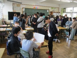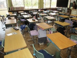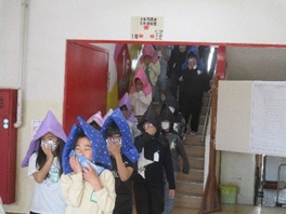 地震、それに伴い家庭科室からの出火を想定した避難訓練が実施されました。放送に反応して、速やかに机の下にもぐり、その後、先生の指示で防災頭巾をかぶり、口と鼻をハンカチで押さえながらの避難がスムーズに行われました。安全担当の先生から「お・か・し・も」について再確認し、校長先生からは、「自分の命」と「友達の命」を守る行動についての話を聞きました。ご家庭でも、災害時における行動について、話す機会を設けていただけると幸いです。