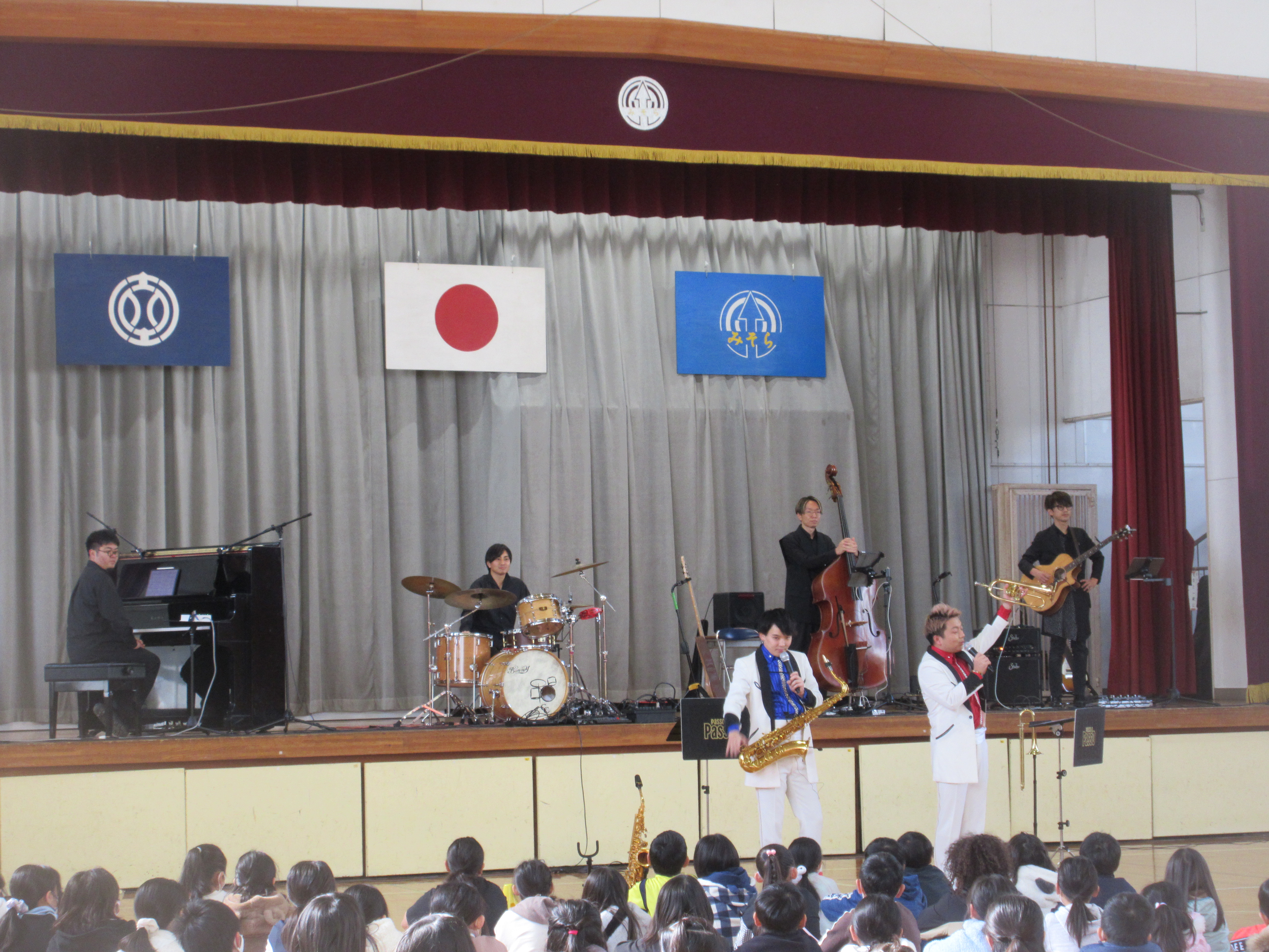 プロ音楽科ユニットのPasso aPasso(パッソアパッソ)をお招きして、芸術鑑賞会を開きました。 「A列車で行こう」といったジャズのスタンダードナンバーから、子どもたちに聞きなじみのある アニメの曲まで、楽しく素敵な音色が体育館に響き渡りました。保護者や地域の方たちも大勢来校し 楽しいひとときを過ごしました。
