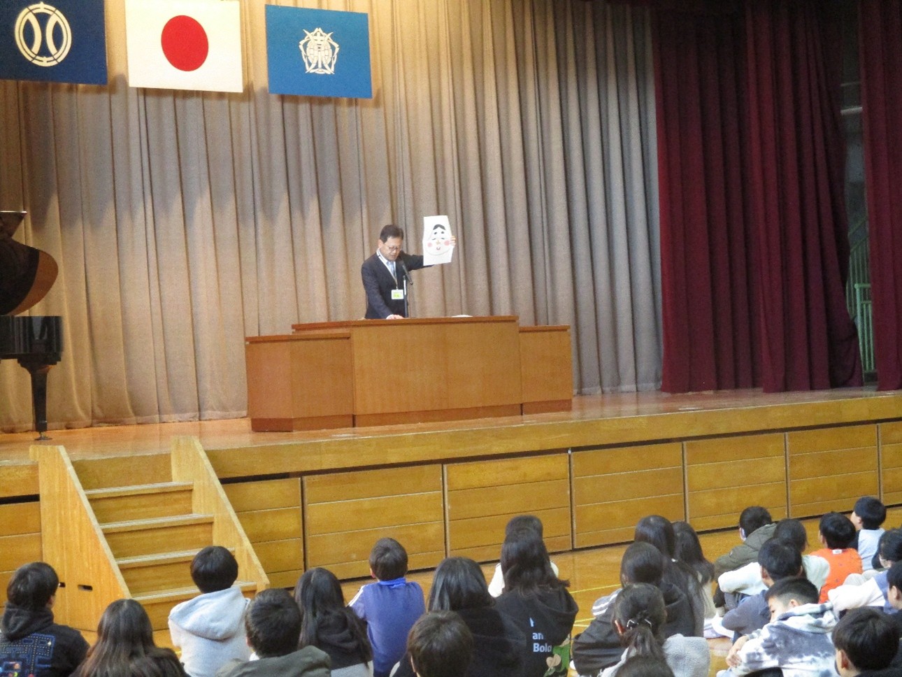 校長先生からは節分についての話がありました。自分の心の中にいる「ちゃんとやらなくてもいっか…」「ちょっといたずらしちゃおうかな。」という鬼を退治して、福を呼び込もうと子どもたちに話しました。